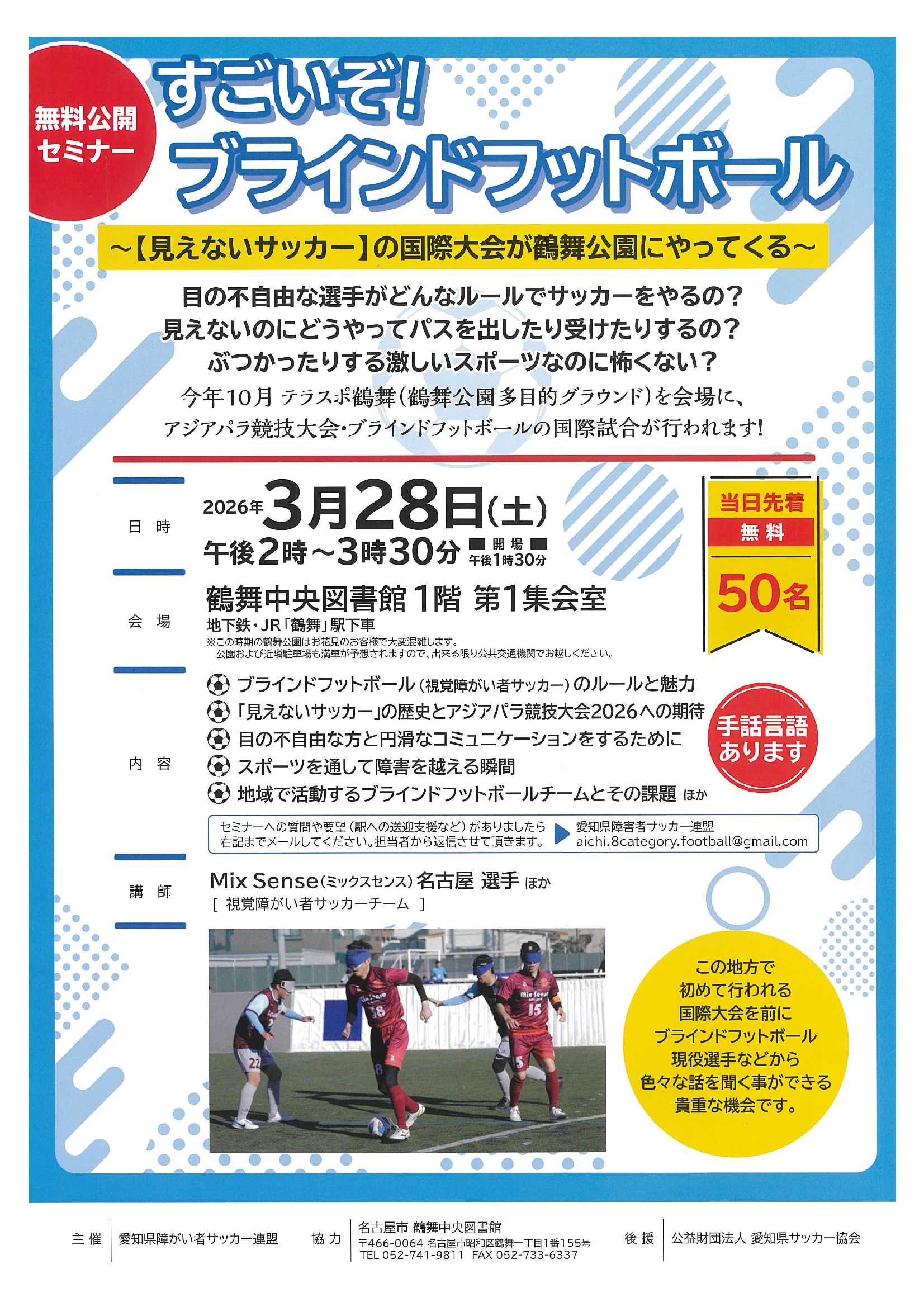 開催に先立ち、ブラインドフットボール競技の紹介を始め、ルールと魅力等について、鶴舞中央図書館にて無料公開セミナーが開催されます。チラシはコチラ